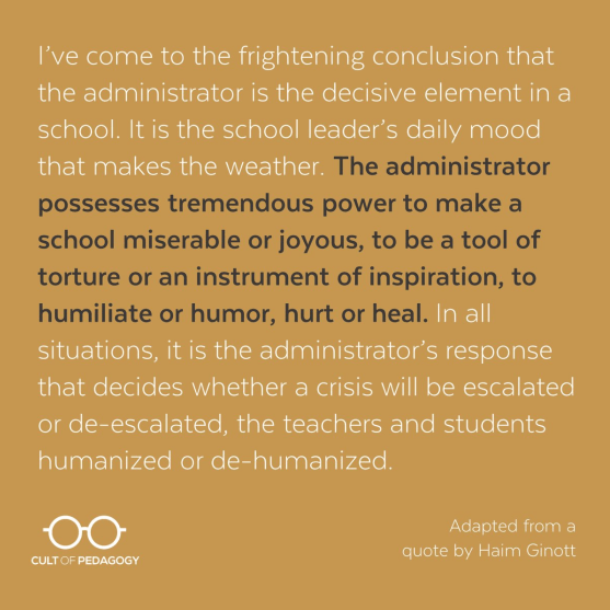 The collective whole sets the mood, culture and tone of a school. There are many leaders within any school. When teachers start seeing themselves as leaders in education and admin empowers such leadership that’s when education will change