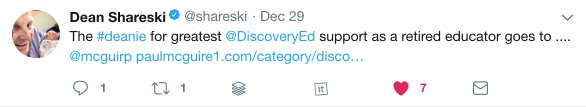 I have decided to focus on Discovery Education. Why? First, I received a #Deanie from Dean Shareski, a wonderful educator and a great supporter of teachers. I was pretty happy to get some recognition from Dean, I have a great deal of respect for his writing and his opinions.