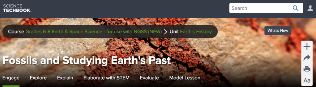 On the right-hand side, you will notice a text button. Many of the Science Techbook lessons are now available in a variety of reading levels. This material can be directly assigned to students with a simple link. All material is divided up into sections starting with Engage and moving on to Elaborate with STEM plus a Model Lesson this all follows the 5E Inquiry Learning model.