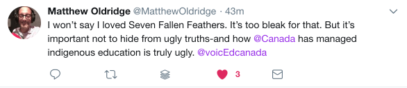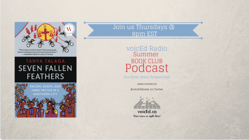 The issues are so important. VoicEd Radio, Derek Rhodenizer and Debbie Donsky are actively promoting Seven Fallen Feathers through podcasts, tweets and Facebook posts. Because of them, I am reading the book and am horrified by the long history of abuse and injustice against First Nations people that has yet to be resolved in this country. I knew about this sad story, but when you bring it down to single students, it really hits home – a huge shame against individuals and a people.