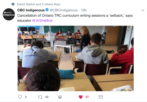 Associated with Seven Fallen Feathers is another issue, the ending of curriculum writing directed by the Truth and Reconciliation Commission. The Ontario Government is actively trying to head back to the old days, not only when it comes to Health Curriculum but also how we look at issues surrounding indigenous people in Canada. The blatant ignorance that prevailed up to the recent past is something the current regime wants to return to. All teachers worth their salt need to publically condemn this action.