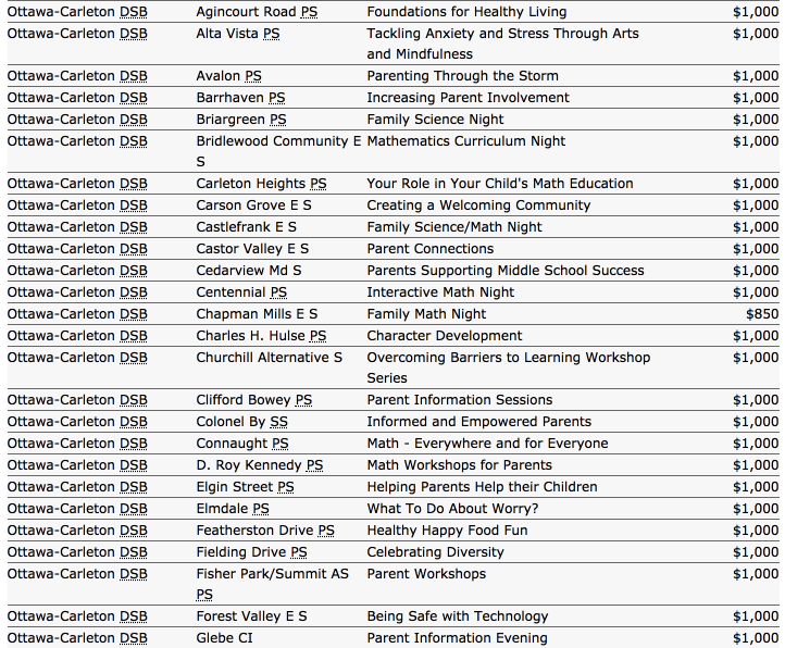 In the affluent school communities, the workshops funded through PRO Grants (see a partial list below) will be made up through fundraising in the community. This is one of the unseen inequities in Ontario’s schools. Communities that have the money to support their schools generally have a healthy account that parents can put to use in a whole variety of ways including funding the programs previously supported through the PRO Grant.