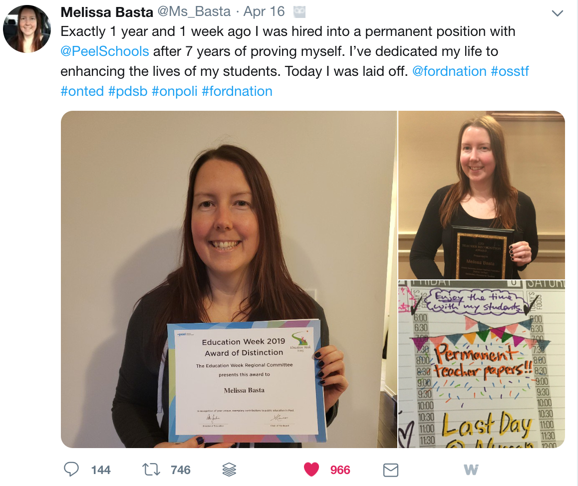 I am encouraged by Andrew Campbell. He is quietly doing a wonderful job through social media of cataloguing the lay-off notices and now the stories of teachers who are being laid off. I am encouraged by Doug Peterson, who is featuring some of the posts written supporting teachers and students each week. I am also encouraged by the teachers who are speaking out about being laid off. These are brave people who are putting a human face to a great injustice.