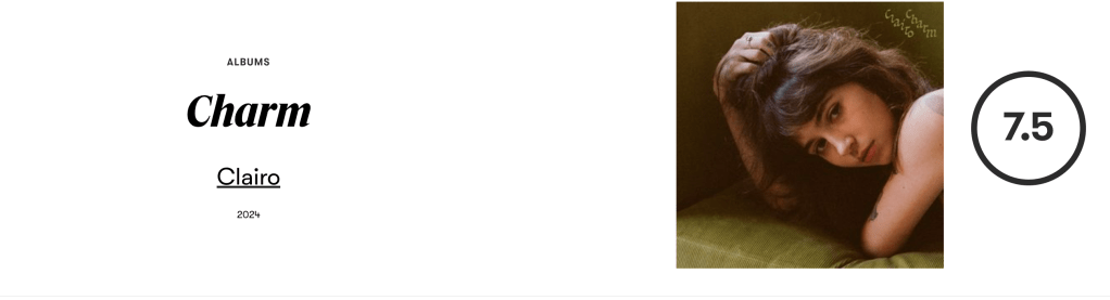 Clairo is 28 year old Claire Cottrill. Like many of her generation, she began posting music on the internet at age 13. Clairo rose to prominence following the viral success of the music video for her single “Pretty Girl” in 2017. Charm is her third studio album Clairo, released last July.
