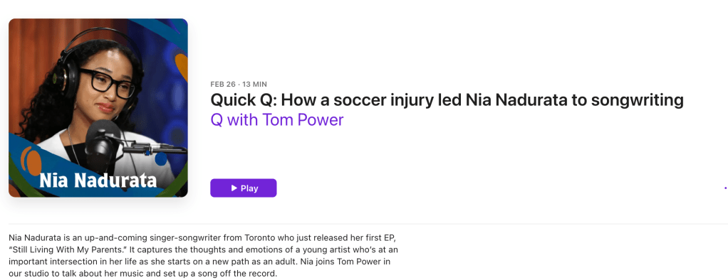 Nia Nadurata is an up-and-coming indie pop singer from Toronto who just released her first EP, Still Living With My Parents. It captures the thoughts and emotions of a young artist who’s at an important intersection in her life as she starts on a new path as an adult. Nadurata made her solo debut in 2023 and has collaborated with artists such as Russ, Preston Pablo and Nonso Amadi. She joins Tom Power in our studio to talk about her music and to set up a song called Souvenirs