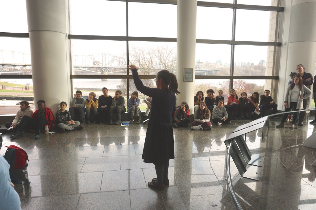 One of the most interesting moments occurred when we all gathered around the iconic sculpture by Bill Reid, The Spirit of Haida Gwaii. I had been asked to talk about the significance of the sculpture, but instead, I turned this over to the teacher candidates to stand in front of the grade 7s to talk about the piece.