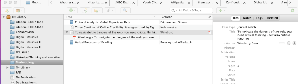 I am also starting (again) to look at a different methodology – one that can connect to the research I hope to do one day. It is interesting how we make these decisions. In speaking with my supervisor, we talked about a method of research Sam Wineburg used to study the thinking patterns of students and professors when assessing the value and credibility of a variety of historical sources ( see Wineberg, S. (1991). On the reading of historical texts: Notes on the breach between school and academy. American Educational Research Journal, 28, p. 495-520.) Wineburg used think aloud techniques to gather information on what his subjects were thinking about as they reviewed various sources. This happens to be an area my supervisor is very interested in so I am now reading up on the literature about this methodology. I am starting with Verbal Protocols of Reading: The Nature of Constructively Responsive Reading By Michael Pressley and Peter Afflerbach (1994). This sets the stage for everything else I will read on this methodology. This work is in its early days, so my Zotero on this topic looks a little bleak.