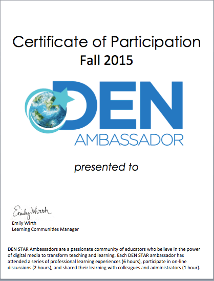 We went through all the video portions of lessons 2 and 3 and these were really helpful. A Day in the Life of a Discovery Educator is great – it shows lots of practical applications for how a whole variety of material can be used in the classroom. We finished off with the handing out of DEN Ambassador certificates which everyone really liked! I even showed them my DEN Star!