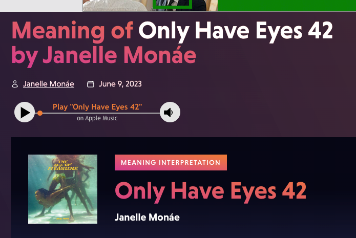 Janelle Monáe Robinson is of course is an immensely successful singer, songwriter, and actor. She has received ten Grammy Award nominations, and won a Screen Actors Guild Award and an Emmy . In April 2022, she came out publicly as non-binary. The song “Only Have Eyes 42” is about being in a polyamorous relationship and being open about it. According to Songtell, the lyrics appear to be an account of a consensual and satisfying threesome.