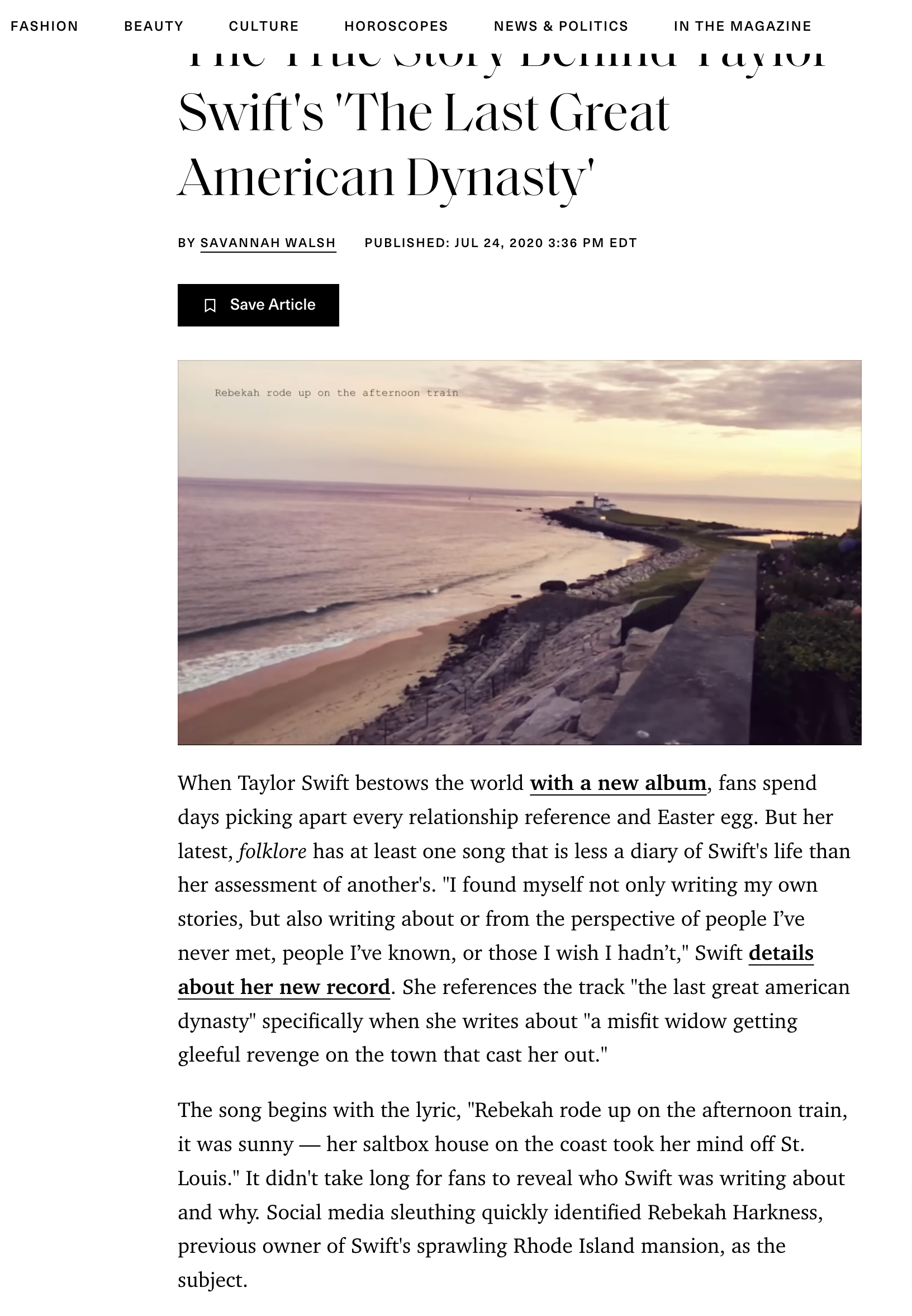 “The Last Great American Dynasty” is a song about the life of the American socialite Rebekah Harkness, who once lived in Swift’s Rhode Island mansion.